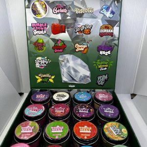 Grape Fuel, LA Confidential, Blue Sherbet, Tres Leches, Blue Dream, Ghost OG, Northern Lights, Grand Daddy Purple, GMO, Cherry Pie, Lemon Octane, Mendo Breath, Sour Jack, Apple Fritter, Green Crack, Gorilla Glue #4 |