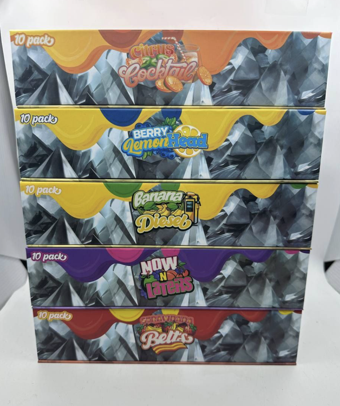 - Flavors Available: Yuzulato, Strawana Belts, Grease Bucket, Banana Diesel, Starburst OG, Citrus Cocktail, Mandarina, Berry Lemon Head, Guava Glue, Now N Laters, Strawnana Belts, Georgia Pie, Melon Haze, Rainbow Berries, Sticky Smoothie, Cherry Alien Dawg, Melon Dew, Exotic Animal, Zky Walker, Tropsicle, Grape Cream Cake